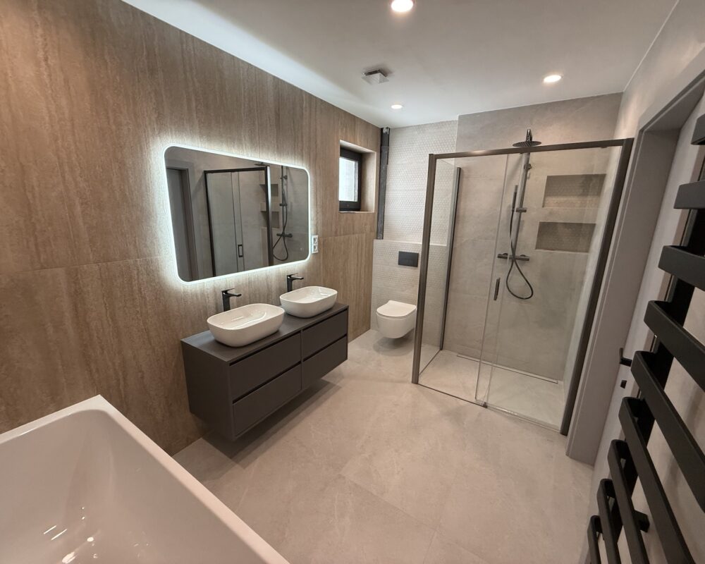 Součástí realizace je instalace závěsných i stojících WC, umyvadel, sprchových koutů, van, baterií, podomítkových systémů i doplňkových prvků. Dbáme na precizní provedení, správné napojení na rozvody a dlouhodobou spolehlivost všech instalovaných komponentů.
